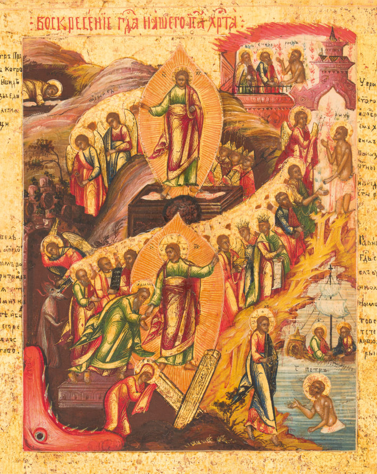 The published icon represents a traditional version of the Resurrection—Descent into Hell, structured around a classical vertical axis, with two images of Christ uniting the heavenly and earthly realms. The composition is enriched with additional scenes characteristic of the Palekh school, revealing the meaning of the Resurrection: Christ rose bodily, granting humanity eternal life, and even the Apostle Peter, who had betrayed Him but repented, is restored to his apostolic rank. The upper part of the composition is crowned by an image of the Trinity in the iconographic type The Hospitality of Abraham, which enhances the theological and artistic unity of the artwork.