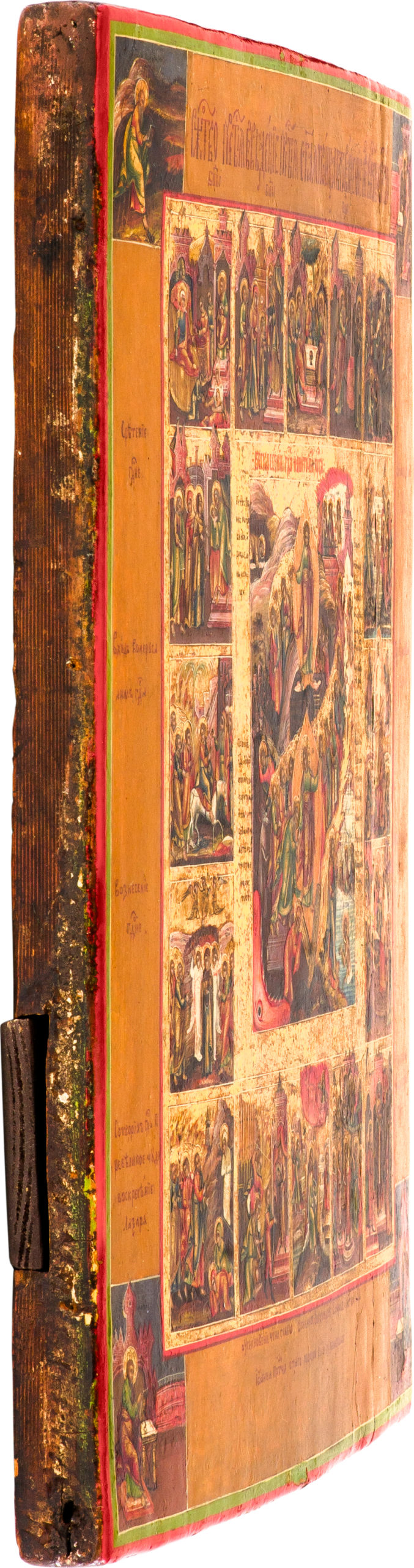 The icon with feast scenes in the borders was executed in the Palekh workshop tradition and is distinguished by its refined painting and close attention to detail. The golden borders separating the central panel from the marginal scenes create the effect of a single, luminous space, while the exquisite rendering of landscapes, architecture, and figures—from blades of grass to marble sarcophagi—attests to the hand of a master of the highest level and to the icon’s origin in one of the finest Palekh workshops of the second quarter of the 19th century.