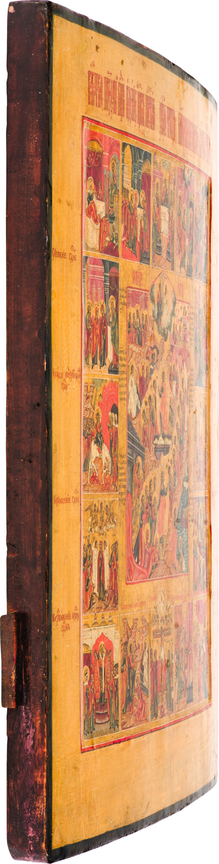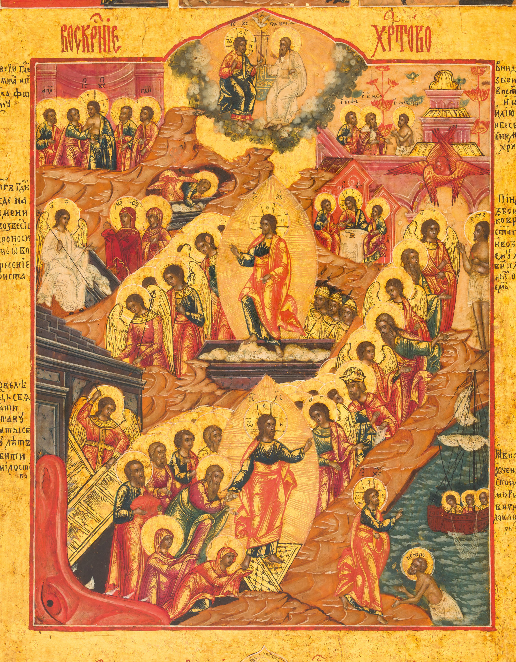 The iconography, which dates back to the apocryphal Gospel of Nicodemus, brings together the key moments of the Easter events. The Festive Cycle around the perimeter of the centerpiece is built around the central compositional axis, supported by the image of the Trinity in the upper row and ending with the Crucifixion in the lower field. This structure combines the key meanings of Christian history: the suffering, death, and Resurrection of Christ as the source of salvation.