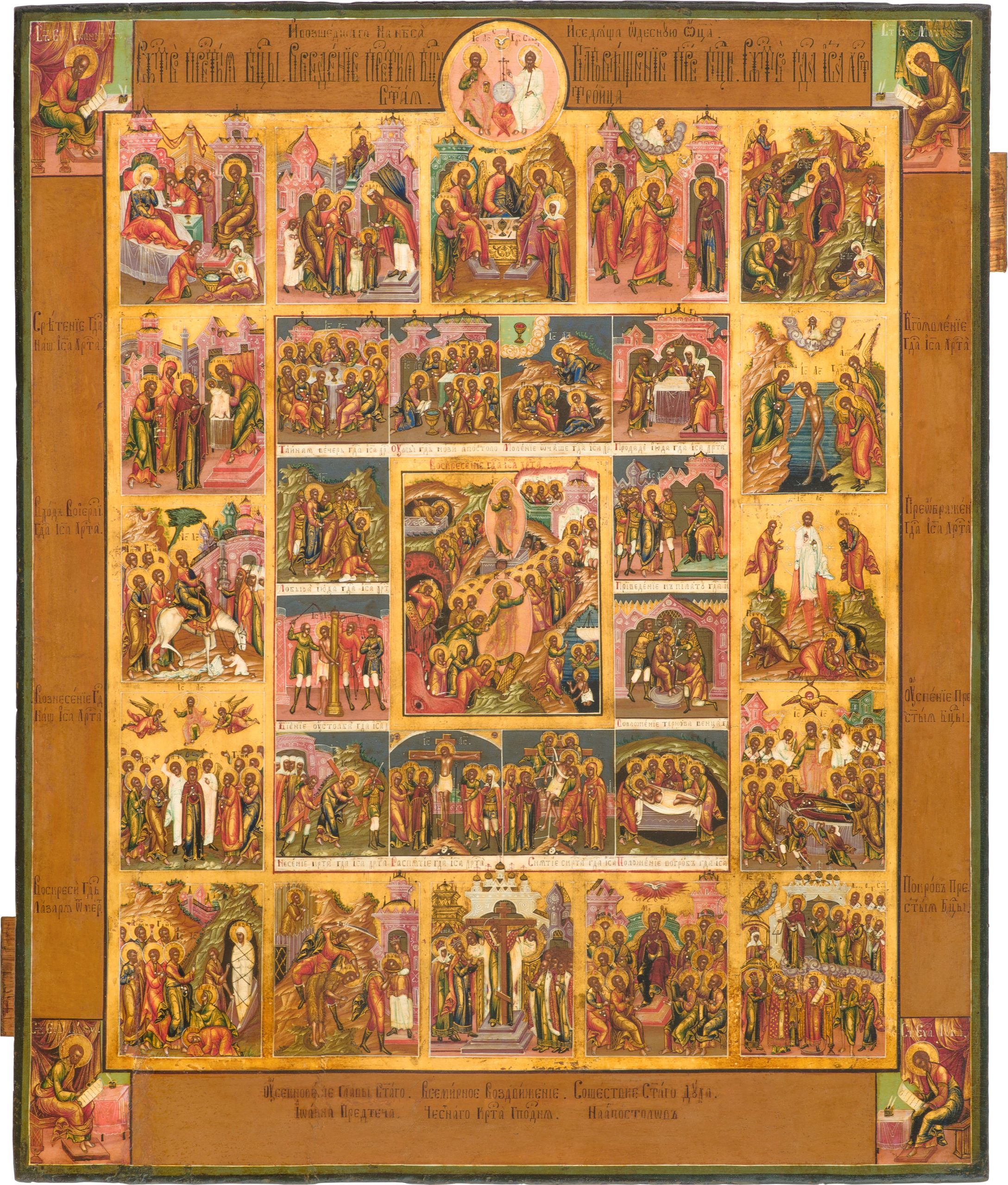 The centerpiece is framed by cycles of feasts and the Passions, with Evangelists in the corners and Soprestolie (Enthronement) at the top, paralleling the Old and New Testament Trinities. Palekh style is evident in pink shades, steep whitewashed hills, refined architecture, detailed faces, and gilded draperies, dating the icon to the mid- to late nineteenth century.