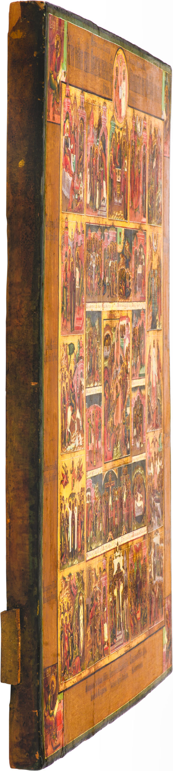 The Resurrection—the Descent into Hell, with the Twelve Great Church Feasts, was a central iconographic scheme in Vladimir villages, especially Palekh. Christ is depicted rising from the tomb and descending into Hell, forming a central axis around which the composition is organized. The icon also includes Christ’s revelation to the Apostles, emphasizing His mercy and the promise of heavenly life.
