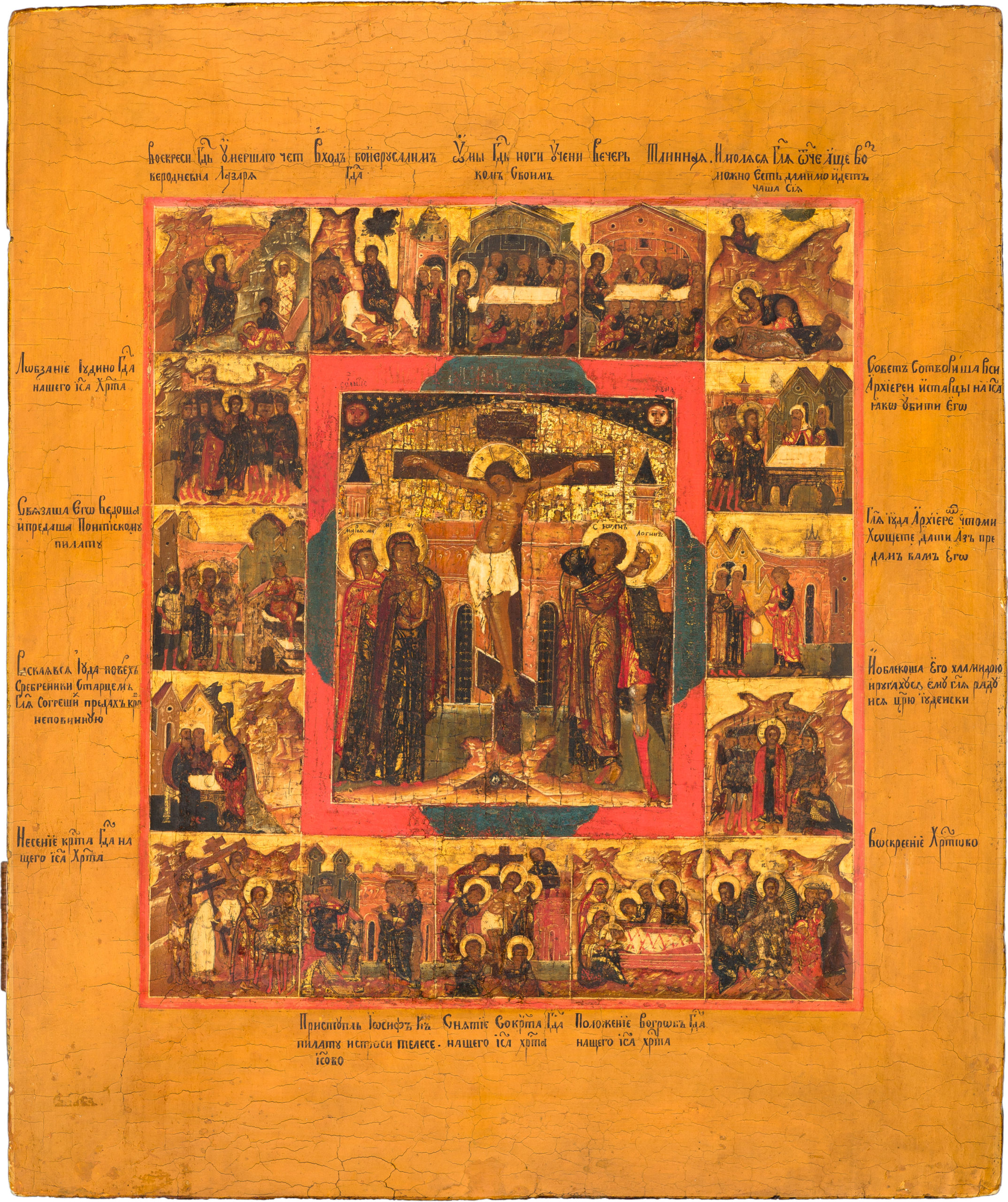 Распятие, с историей Страстей Христовых и праздниками в 16 клеймах. Средник: около середины XVII века. Поволжье (Ярославль?) Поля: антикварная реставрация XIX века.