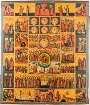 The centerpiece consists of six Creation scenes. The main axis depicts God Sabaoth with the Angelic host and the enthroned Christ the Judge with John the Baptist and the Virgin. It is followed by the six Feasts symbolizing the six days of the week. The border scenes of such Orthodox icons depict the Evangelists, Saints, Church Fathers, the Fools-for-Christ, and the Blessed.